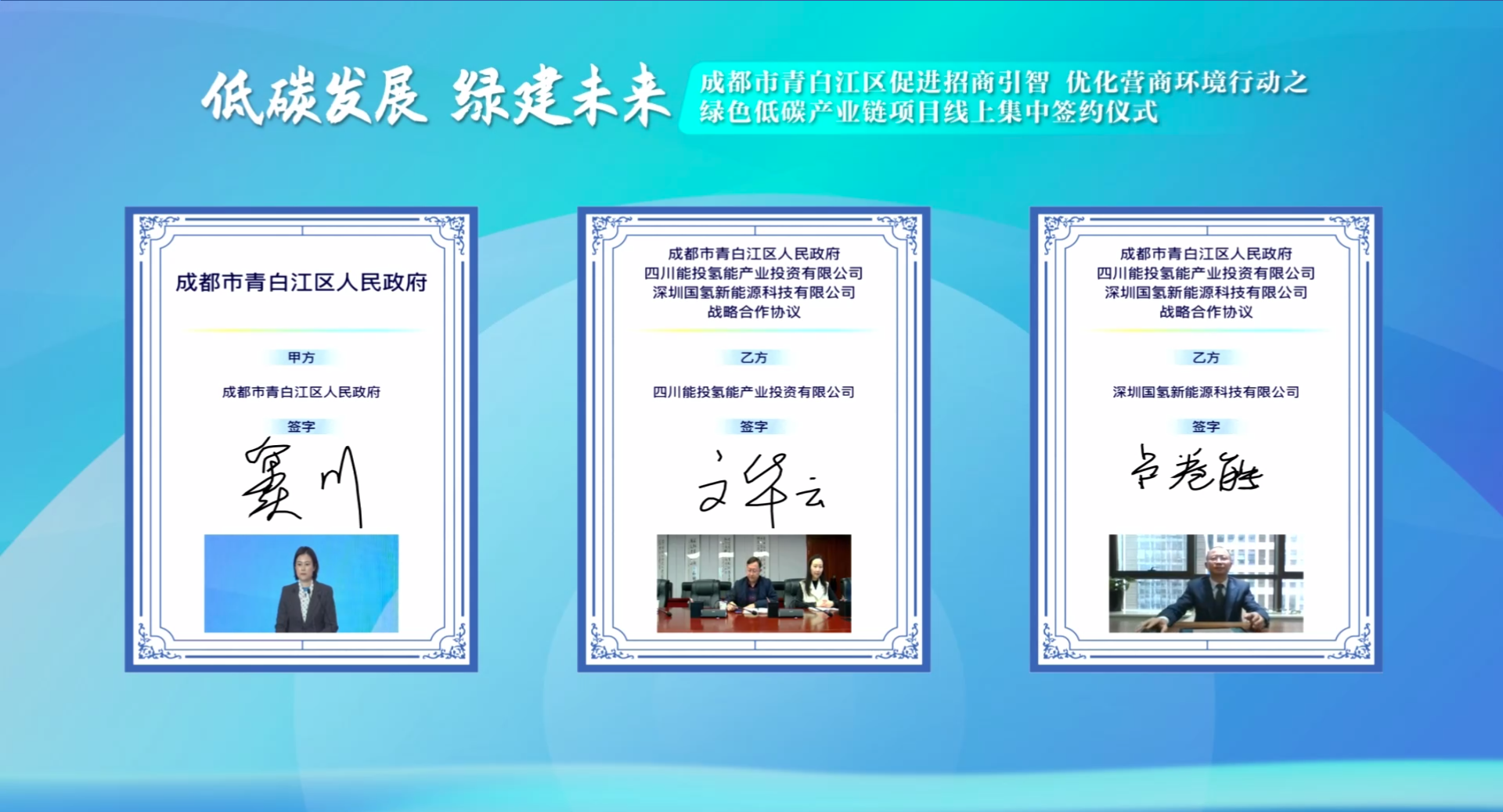 2022年3月2日,以“低碳發展,綠建(jiàn)未來”為主題的(de)成都(dōu)市青白(bái)江區促進招(zhāo)商引智,優化營商環(huán)境行動之綠色(sè)低碳產業鏈項目線上集中簽約(yuē)儀式,在成都市青白江區舉行。 會議現場,深(shēn)圳國(guó)氫新能源科技(jì)有限公司,四川能投(tóu)氫能產業投資有限(xiàn)公司同成都市青白江區人民政(zhèng)府簽署了戰略合作協議。 根據協(xié)議,三方將借助綠色低碳相關領域業務(wù)合作契機,整合各自(zì)優勢資源,聚...